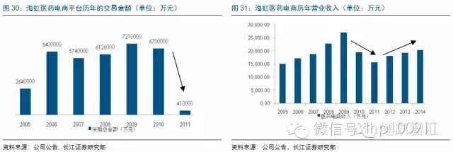 2010年以前海虹的醫(yī)藥電商年度交易額及營收規(guī)模保持穩(wěn)步增長,而由于2010年受國家藥品招投標(biāo)改革政策的影響,海虹醫(yī)藥電商交易平臺陸續(xù)被地方政府買斷遷移,因此營業(yè)收入出現(xiàn)萎縮。后續(xù)在地方政府鼓勵醫(yī)藥電商的政策支持下,公司已向全面的即時電子商務(wù)模式轉(zhuǎn)變,電商業(yè)務(wù)的交易總額與營業(yè)收入也呈現(xiàn)穩(wěn)步增長態(tài)勢。