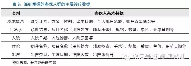 第二、PBM系統(tǒng)審核的患者診療記錄。只要患者需要醫(yī)保報銷、醫(yī)保局需要使用PBM系統(tǒng)鑒定診療行為的合理性,醫(yī)院均需要將患者的診療數(shù)據(jù)上傳到PBM系統(tǒng)。通過該渠道,海虹可掌握8億參保人群從門診到住院、出院整個醫(yī)療過程中的檢查、診斷、用藥、手術(shù)等所有診療數(shù)據(jù)。