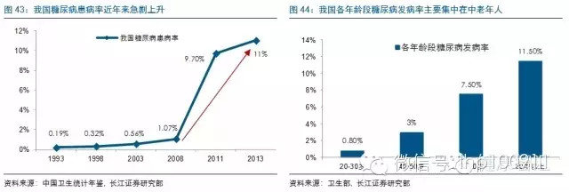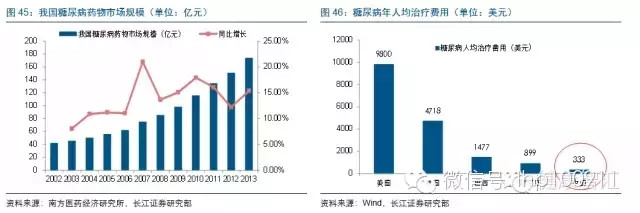2013年我國確診的糖尿病患者達(dá)9840萬人全球居首(占全球四分之一),IGT前期患者更是多達(dá)3.16億。且診療存在“50%定律”,即有一半不知已患病,而患者中只有一半被診斷,診斷患者中又只有一半接受治療,接受治療的又只有一半接受良好治療,最后達(dá)到預(yù)期療效的患者僅6.25%!