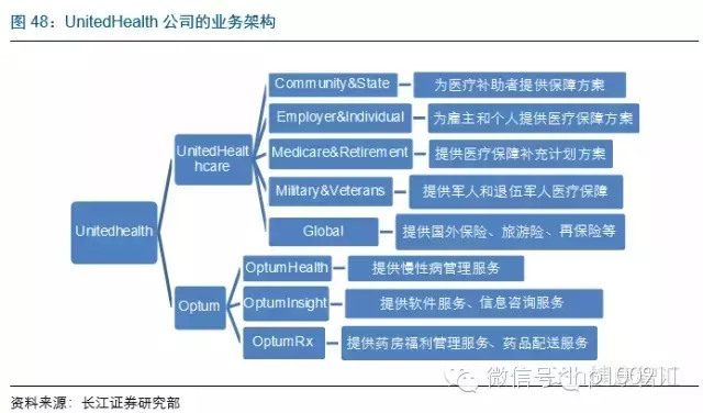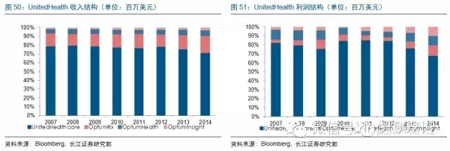 聯(lián)合健康公司可以看作“保險公司+健康管理公司+PBM公司+TMT公司”的架構(gòu),旗下包括兩大平臺,即UnitedHealthcare和Optum,前者屬于保險業(yè)務(wù),2014年收入占比71.3%,后者又分為三個平臺分別提供慢性病管理(健康管理)、醫(yī)療軟件信息咨詢(TMT)和藥房福利配送服務(wù)(PBM)