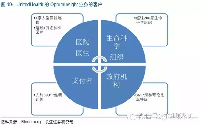 第二、OptumHealth,目的是為參保人群提供醫(yī)療健康落地服務(wù),從而降低賠付率,通過收集患者的數(shù)據(jù)進(jìn)行分析,醫(yī)院醫(yī)生據(jù)此可獲得決策支持,為患者提供最優(yōu)化治療,在診所、流動車或者雇主公司為患者提供職業(yè)保健、醫(yī)療和牙醫(yī)治療、預(yù)防等服務(wù),同時提供呼叫中心支持、專業(yè)護(hù)士、數(shù)據(jù)分析、健康金融等服務(wù)。OptumHealth已為3800萬癌癥患者、新生兒、產(chǎn)婦,5700萬有心理問題、器官移植者、腎病患者等提供長期護(hù)理服務(wù)。收入主要來自會員的固定保費或者管理費;