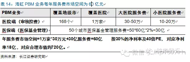 PBM業(yè)務(wù)存在兩個盈利點,即醫(yī)院端年服務(wù)費,及醫(yī)?;鸸芾矸?wù)費,收入空間約60億,對應(yīng)市值空間約720億: