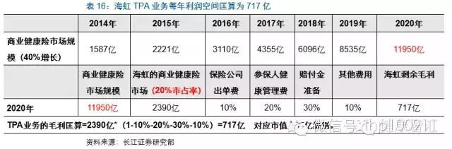 TPA業(yè)務(wù)顛覆傳統(tǒng)核保核賠獲得分成的模式,而是在慢病險種領(lǐng)域占據(jù)主場地位,至2020年毛利空間達(dá)百億級別,對應(yīng)市值在萬億級別:我們認(rèn)為,政府鼓勵商業(yè)健康險發(fā)展的核心動力是增加商保的支付比例,若僅按現(xiàn)有模式針對健康人群發(fā)布產(chǎn)品,永遠(yuǎn)無法達(dá)到為醫(yī)保分憂的目標(biāo)。因此,海虹針對慢病人群的商業(yè)健康險具有巨大的政策支持力度和市場空間。未來5年商業(yè)健康險市場規(guī)模達(dá)到萬億已是市場共識,假設(shè)我國商業(yè)健康險未來以年均40%增長,我們預(yù)計海虹控股有能力占據(jù)20%的市場份額,2020年海虹有望占據(jù)2390億保費收入。再假設(shè)保險公司分得10%的出單通道費、對參保人的管理費用約20%,并扣除30%的賠付金準(zhǔn)備、10%的人工和系統(tǒng)等其他費用,則海虹剩余毛利為717億元,對應(yīng)市值則在萬億級別。
