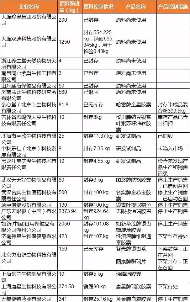 會心堂(北京)生物科技有限公司、吉林省雁鳴湖大豆生物科技有限責(zé)任公司、北海市巨欣生物科技有限公司、中科樂仁(北京)科技發(fā)展有限公司、黑龍江寶慶隆生物技術(shù)有限責(zé)任公司等5家企業(yè)購買的原料已投入生產(chǎn),但產(chǎn)品未流入市場。